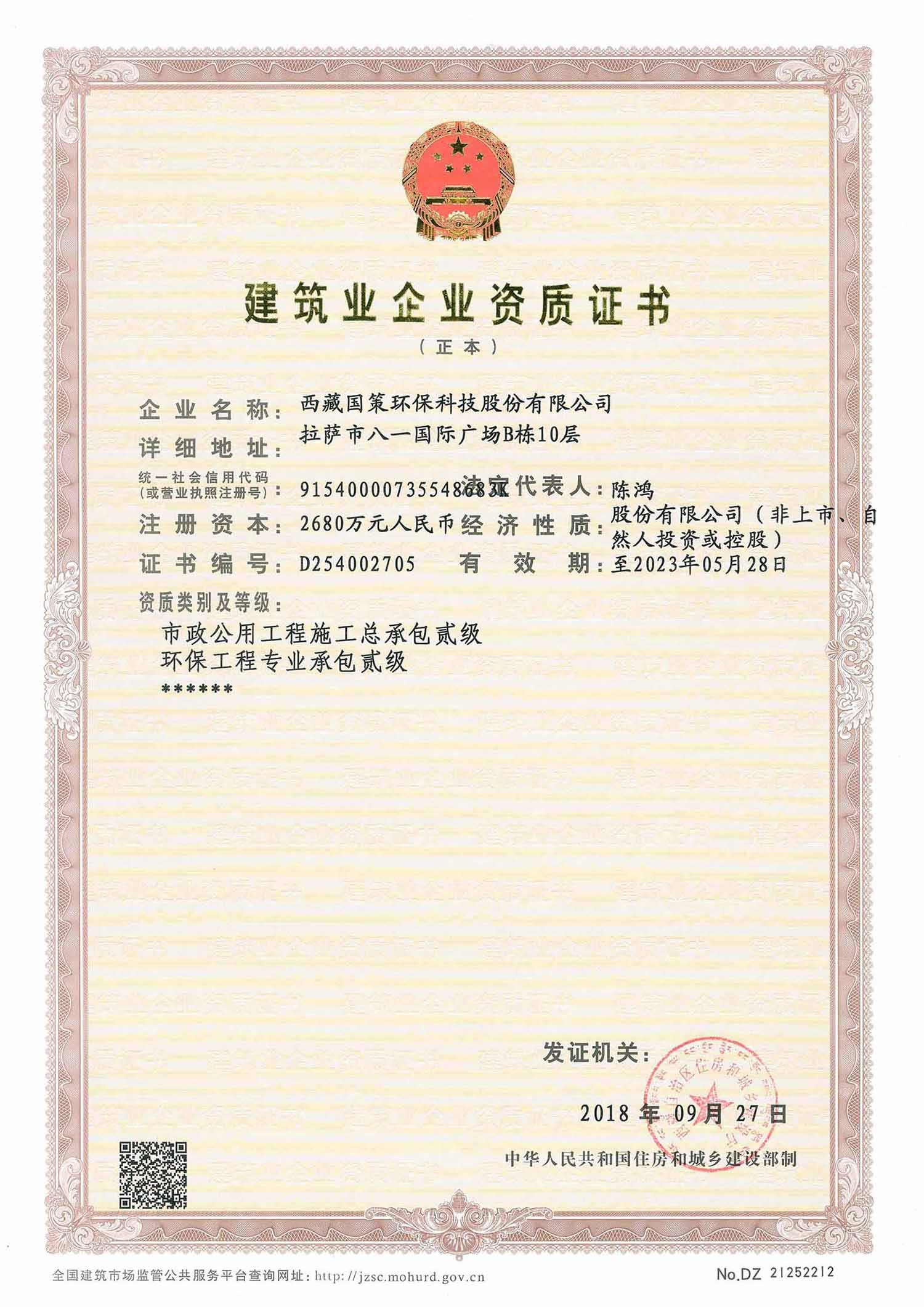 國策環(huán)保擁有住房和城鄉(xiāng)建設部頒發(fā)的建筑業(yè)企業(yè)市政公用工程施工總承包貳級資質(zhì)、環(huán)保工程專業(yè)承包貳級資質(zhì),同時擁有環(huán)保、市政、機電等各類專業(yè)工程技術(shù)人員共計40余人,并先后承擔了眾多污水廠、垃圾填埋場、自來水廠、醫(yī)療廢物處置中心等項目的施工任務。