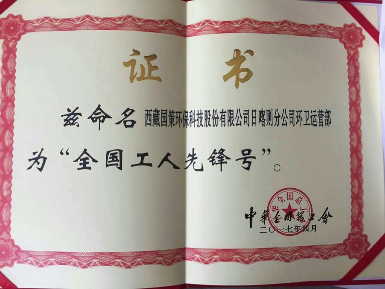 日前,全國總工會(huì)召開“五一”新聞發(fā)布會(huì), 通報(bào)了一批“2017年全國工人先鋒號(hào)”。西藏國策環(huán)保科技股份有限公司日喀則分公司運(yùn)營部全體成員在日常工作中勞心勞力、風(fēng)雨無阻、踐行無私奉獻(xiàn)的城市“美容師”精神,被授予“2017年全國工人先鋒號(hào)”,是我司首獲此殊榮。