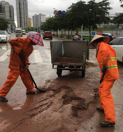 ▲機械化對市郊區(qū)人行道清理山洪積泥、雜草