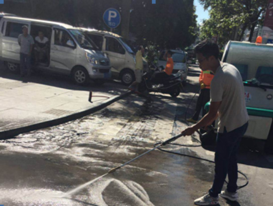 ▲對夜市攤點位油污進行燒堿沖洗,恢復道路原色