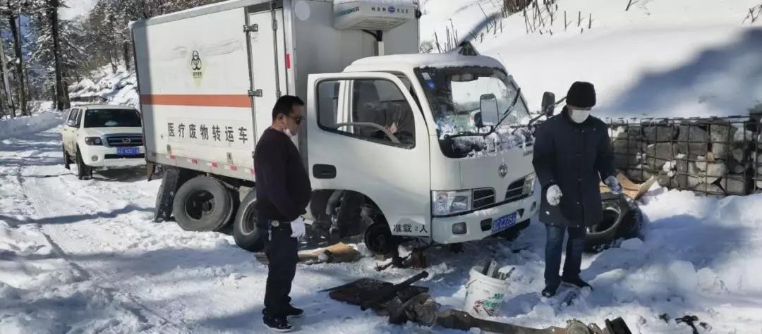 圖為國策環(huán)保醫(yī)療廢物轉(zhuǎn)運(yùn)車在轉(zhuǎn)運(yùn)醫(yī)療垃圾途中,因天氣惡劣車體打滑故障,車輛被困,正在進(jìn)行維修。