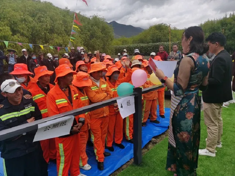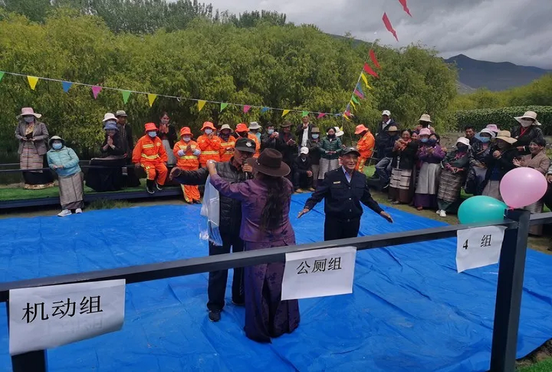 熱情洋溢的歌舞、考驗(yàn)團(tuán)結(jié)的拔河比賽、充滿濃烈民族色彩的抱石頭、翻桶比賽......平時(shí)樸素的環(huán)衛(wèi)工作者們紛紛脫下了沉悶的工作服,穿上了華美的藏袍,伴隨著精彩的活動(dòng),大家或是跳舞唱歌,嘻嘻鬧鬧;或是三五成群,談笑風(fēng)生,整場(chǎng)活動(dòng)高潮迭起、笑聲不斷。